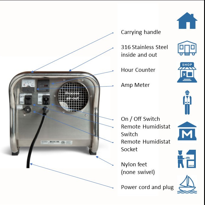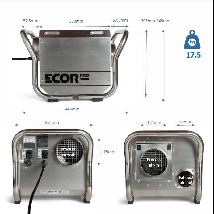 Der robuste und leistungsstarke Industrie-Luftentfeuchter ist sehr einfach zu installieren und bedienen. Das Gehäuse des DryFans ist aus rostfreiem Stahl gefertigt und bietet optimalen Schutz gegen Korrosion durch beispielsweise Salzwasser oder Chemikalien. Der netzartigen Staubfilter kann leicht gereinigt und bei Bedarf ausgetauscht werden. Dieser Trockenmittel-Luftentfeuchter kann optional mit einem externen Hygrostat zur automatischen Steuerung aufgerüstet werden. Das Ecor Pro EPHUM110E Hygrostat kann an der Vorderseite angeschlossen werden und schaltet den Trockner automatisch ein oder aus. Der kompakte und leichtgewichtige Ecor Pro DH2500 (17,5 kg) passt in jede Ecke und ist so konzipiert, dass es sogar kopfüber montiert werden kann. Mit Hilfe der ergonomischen Tragegriffe kann er auch problemlos als tragbarer Luftentfeuchter verwendet werden. Die Handgriffe können entfernt werden und dienen auch als Schutz für die Kanalflansche.