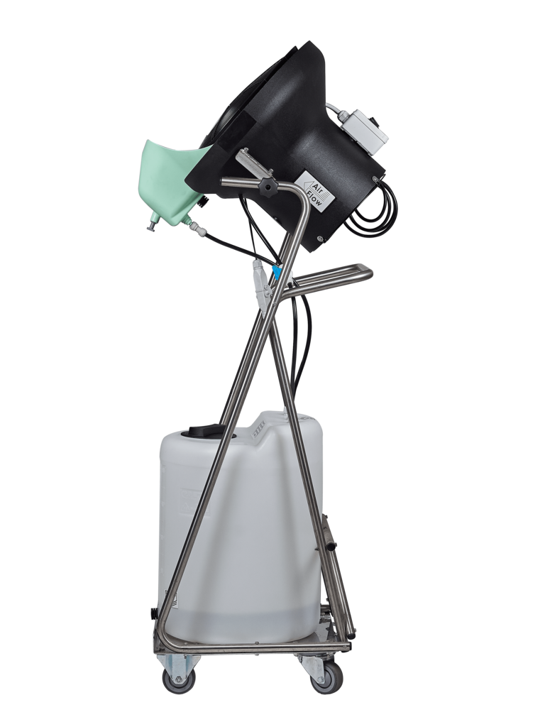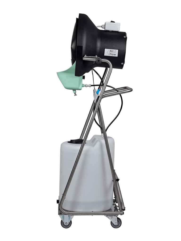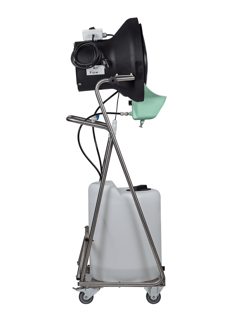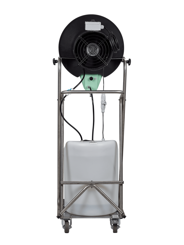 FRANCO UCP M20 Industrieller Luftbefeuchter - mit einer Luftverdrängung von 1.100 m³/Stunde! FRANCO UCP M20 industrieller Luftbefeuchter und Air-Cooler ist sofort einsatzbereit (Plug&Play). Er ist IP55 klassifiziert (Schutz vor Staub und Strahlwasser), einfach zu transportieren und mit einem Wasserbehälter von 60 Litern ausgestattet. Der FRANCO UCP hat eine Befeuchtungsleistung von 30 Liter pro Stunde (600 - 720 Liter pro Tag) in Räumen bis 3.500 m³. FRANCO UCP M20 ist ein Zentrifugalbefeuchter / adiabatischer Befeuchter und hat eine besonders feine Zerstäubung, die mit Nebel verglichen werden kann. Dank des leistungsstarken Gebläses bleiben keine Tröpfchen zurück und der gesamte Raum wird befeuchtet. Die Regelung der Feuchteabgabe kann durch Anpassung des Ventils vorgenommen werden und der verbesserte Schwimmer lässt sich problemlos abnehmen und einstellen. Der UCP ist ein vielseitiger und leistungsstarker Luftbefeuchter, der mit kleinen, mittleren und großen Ventilatoren kombiniert werden kann. Je nach Kombination kann er als Luftbefeuchter, Verdunstungskühler oder Desinfektionsgerät eingesetzt werden. Das robuste Kunststoffgehäuse sorgt für eine einfache Wartung und ermöglicht den Einsatz in verschiedenen Umgebungen, auch unter schwierigen Bedingungen. Im Vergleich zu herkömmlichen Befeuchtungssystemen mit Düsen ist der FRANCO weniger empfindlich vor Kalk- und Schmutzablagerungen. Die Wartung und Reinigung sind einfach - die Pumpe ist mit einer Schnellkupplung befestigt, die bei Wartungsarbeiten einfach entfernt werden kann. Anwendungsbereiche: Für die Befeuchtung von Brutkästen und Brutanlagen, die Kühlung von Stallungen und Zuchtbetrieben. Weiters zur Aufrechterhaltung eines konstanten Feuchtigkeitsniveaus in Umgebungen wie Kühlräumen, Papierindustrie, Tabak-, Holz- und Textilbetrieben und ATUs. In Kombination mit einer Luftumwälzung wird er in Gewächshäusern, Pilzfarmen, Keimräumen, bei der Konservierung von Obst und Gemüse vor Ort sowie bei der Verteilung von Sprühflüssigkeiten eingesetzt. Merkmale: Für Räume bis 3.500 m³ Adiabatischer Befeuchter mit einer Befeuchtungsleistung von 30 Liter / Stunde (720 Liter / Tag) Zentrifugal-Zerstäuber (Niederdruck) mit Motor-Gebläse Air Flow 1.100 m³/h Auch für gekühlte Bereichen Produziert sehr feinen Nebel IP55 Schutzklasse: Schutz vor Staub und Strahlwasser Adiabatischer Befeuchter / Zentrifugalbefeuchter Wasserdruck von 2 bis 6 Atmosphären ist ausreichend Einfach zu transportieren Ausgerüstet mit einer Umwälzpumpe Wassertank des Verneblers: 3/8" Schnellkupplung Wasserablass des Wasserbehälters: mittels Kupplung Niedrige Installationskosten (Plug & Play) Einfaches Service und Wartung Entleeren Sie den Wassertank nach dem Gebrauch immer vollständig, um die Entstehung von Legionellen zu verhindern.